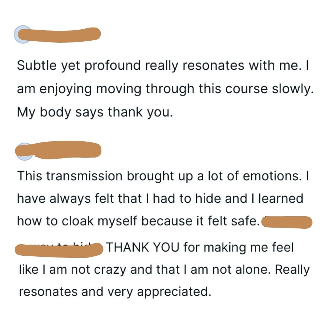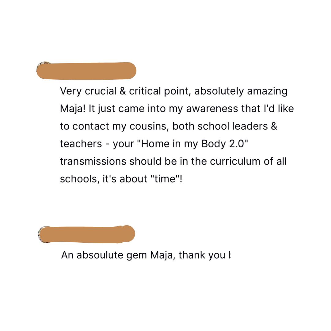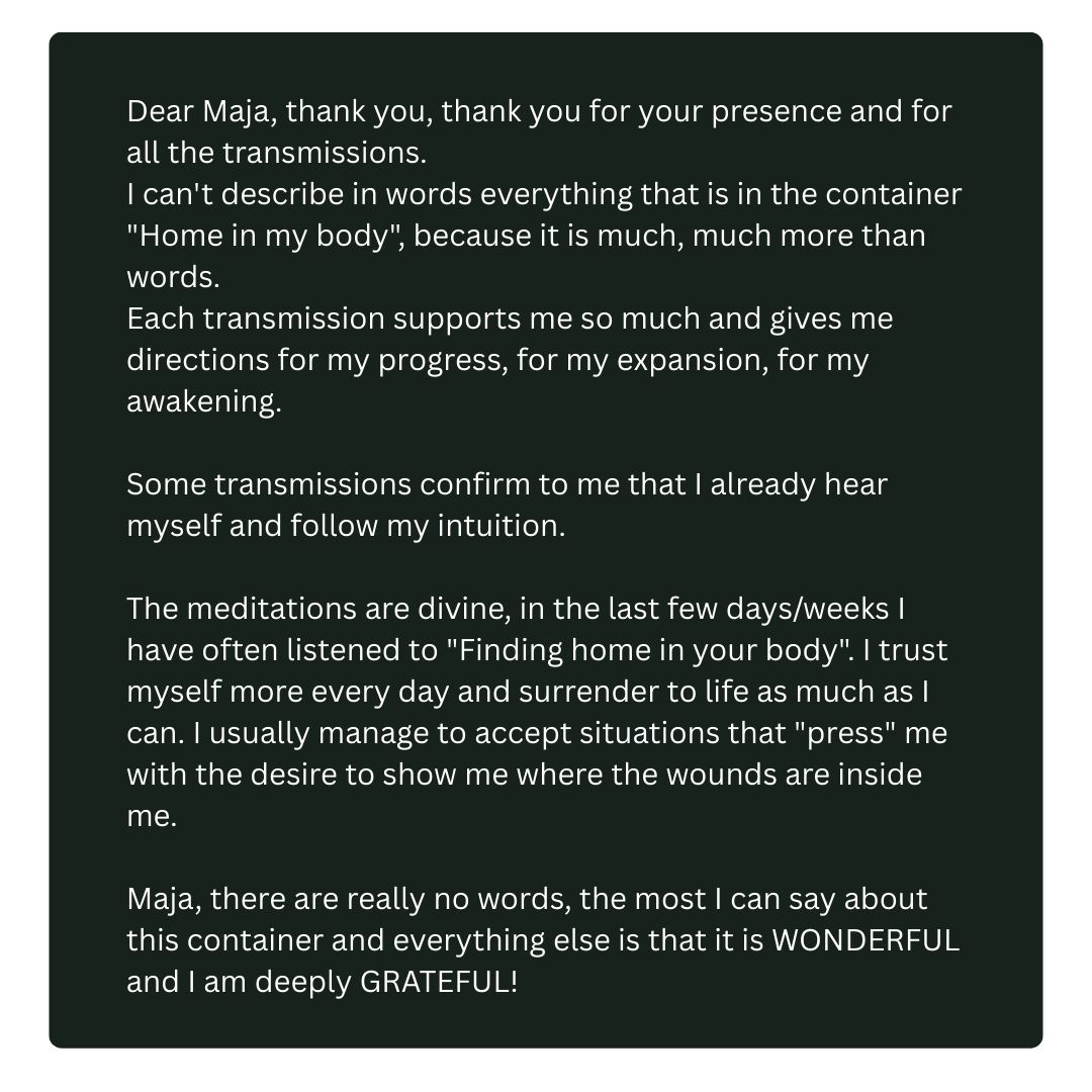 HOME in MY BODY is pre-recorded, so you get instant access to all the transmissions, meditations, practices and journalling prompts.